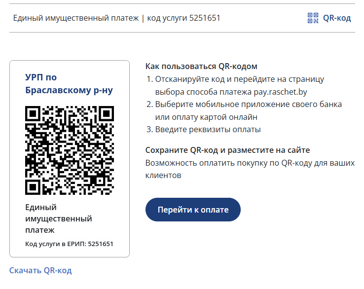 Перейти в Дерево услуг ЕРИП. Выбрать Налоги — Витебская обл. — Браславский р-н — УРП по Браславскому р-ну и выбрать Единый имущественный платеж.